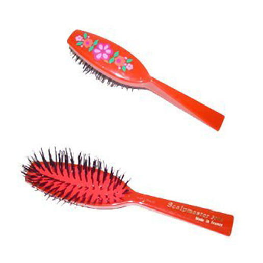 100% boar bristle cushion brush with 11 rows leaves hair smo. * 7 long 1.5 wide x 1.25 tall. Flexible plastic bristles helps to easily detangle without damaging hair. The original scalpmaster 3000 hair brush * purse size with floral graphics on back * 7 long 1.5 wide x 1.25 tall * 7 rows of black nylon bristles set in a red cushion * no ball tip bristles * note hole in cushion at base of handle is to let air out of cushion and to drain water out when brush is cleaned The original scalpmaster 3000 hair brush.